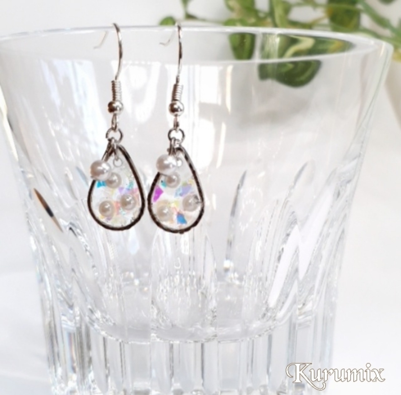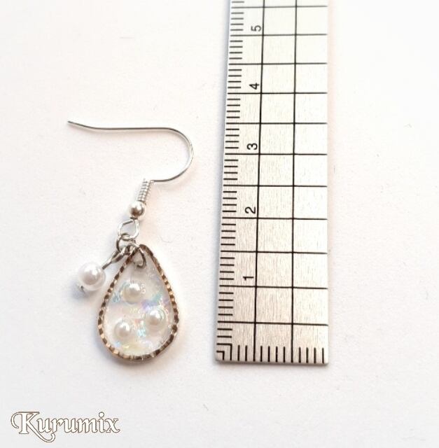 人気のしずく型に小さなパールとオーロラを封入したレジンピアス・イヤリング。