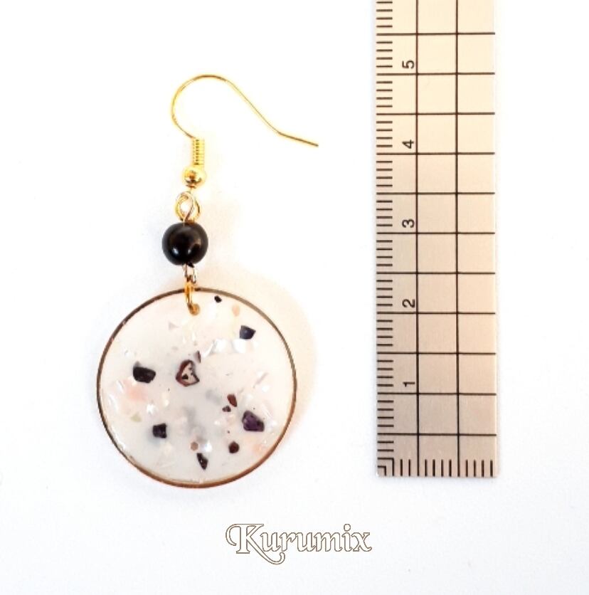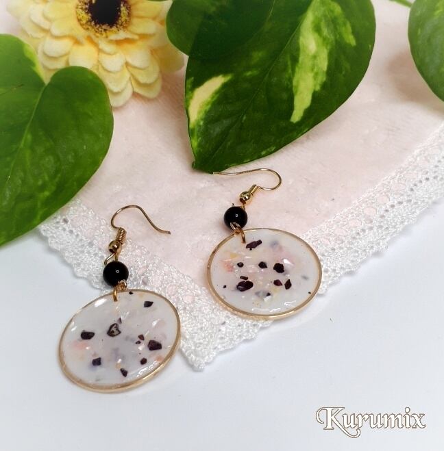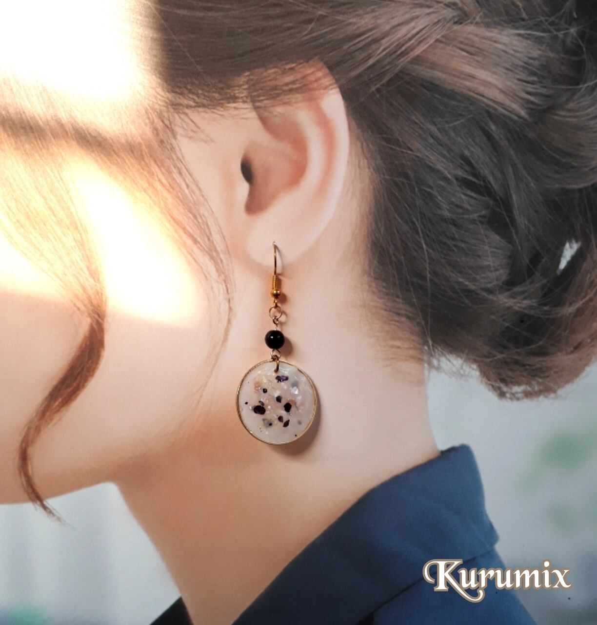 白色ベースに、アメジスト・ピンク・イエローカラーのクラッシュシェルを配合して散りばめたレジンアクセサリーです。小さな黒ビーズを合わせ、しっとりと大人の落ち着いた雰囲気に仕上げました。フォーマルにもカジュアルにもお使い頂けるアイテムです。