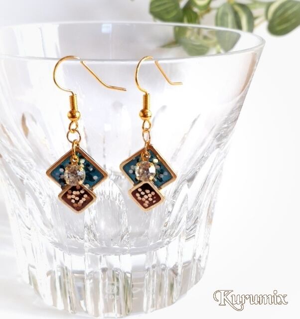 大小のスクエア枠に、藍色とセピア色ベースにホログラムを散りばめました。光りの当たり方や見る角度によって、きらきらと色味と輝きが変わり楽しめます。シンプルなので様々なお洋服に合わせやすいアイテムです。