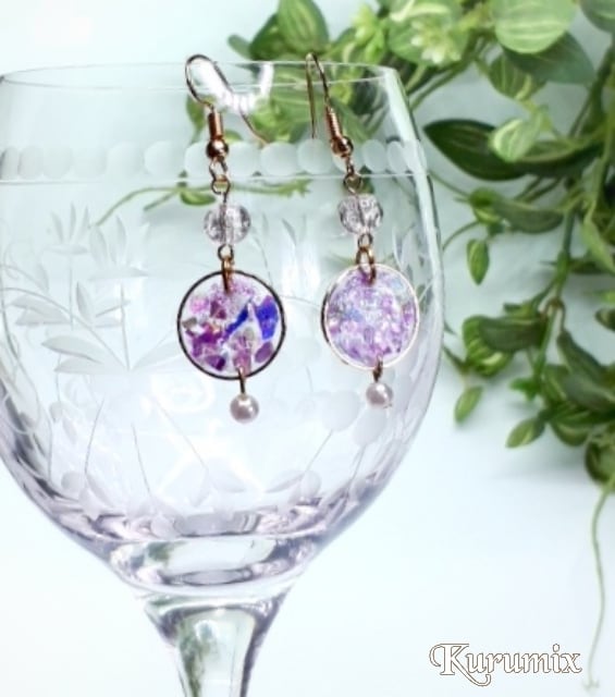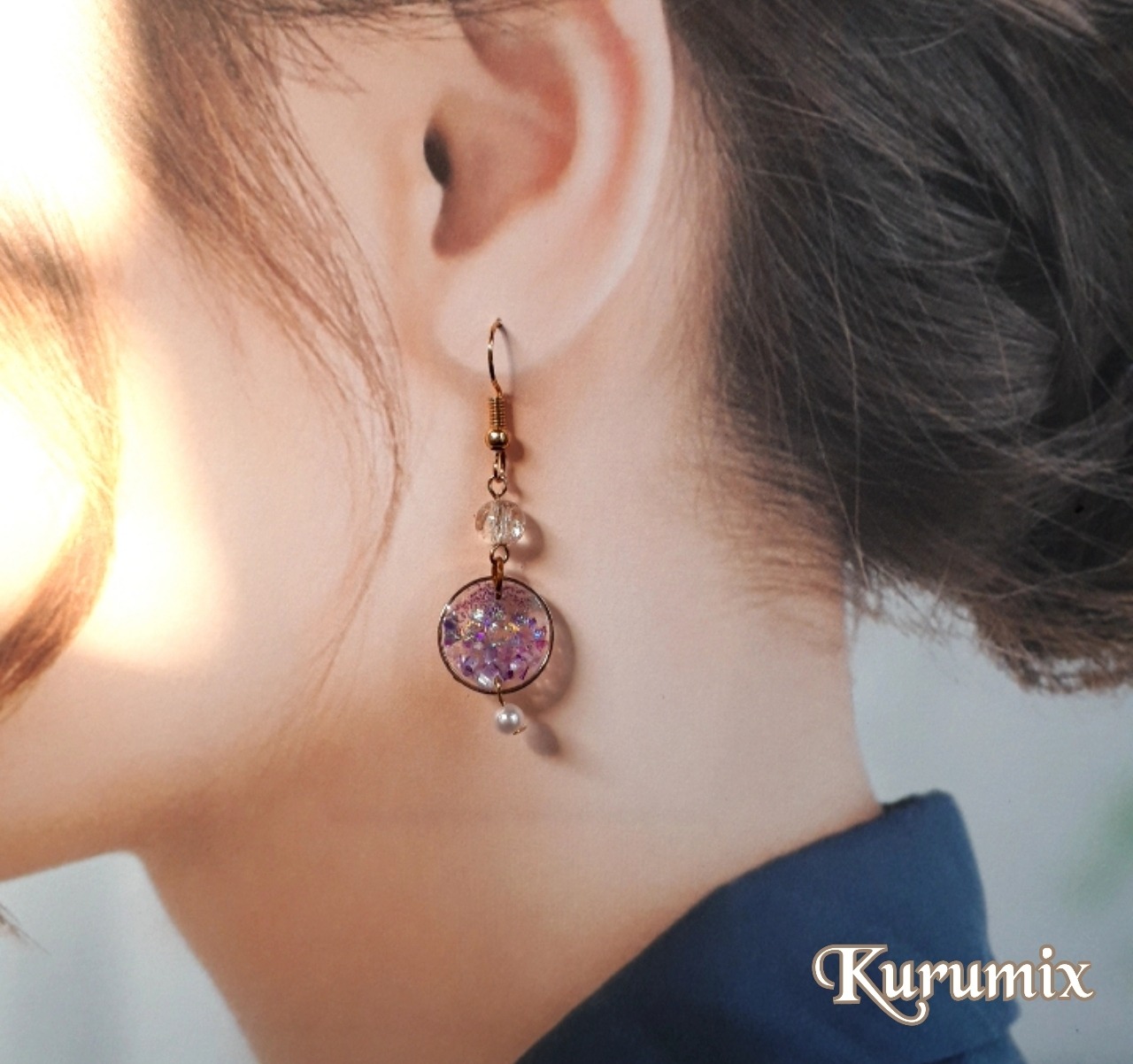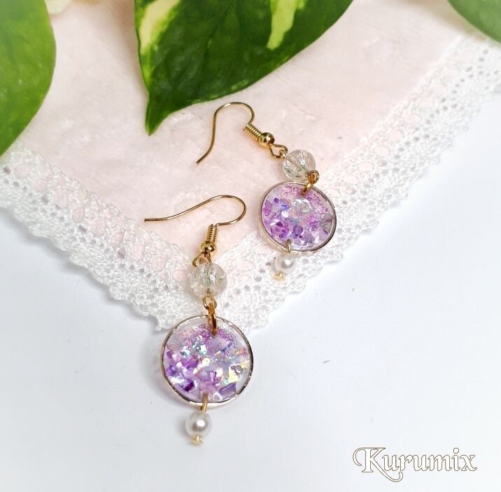 ゴールドの丸枠に パープル系のシェル・オーロラ・ラメを配合して散りばめました。クラッシュボールと小さなパールの3連が ゆらゆら揺れて動きのあるアクセサリーになります。陽射しに当たるとキラキラと輝きを放ち、室内光でも色合いが変わるので楽しめます。