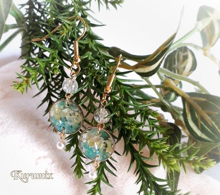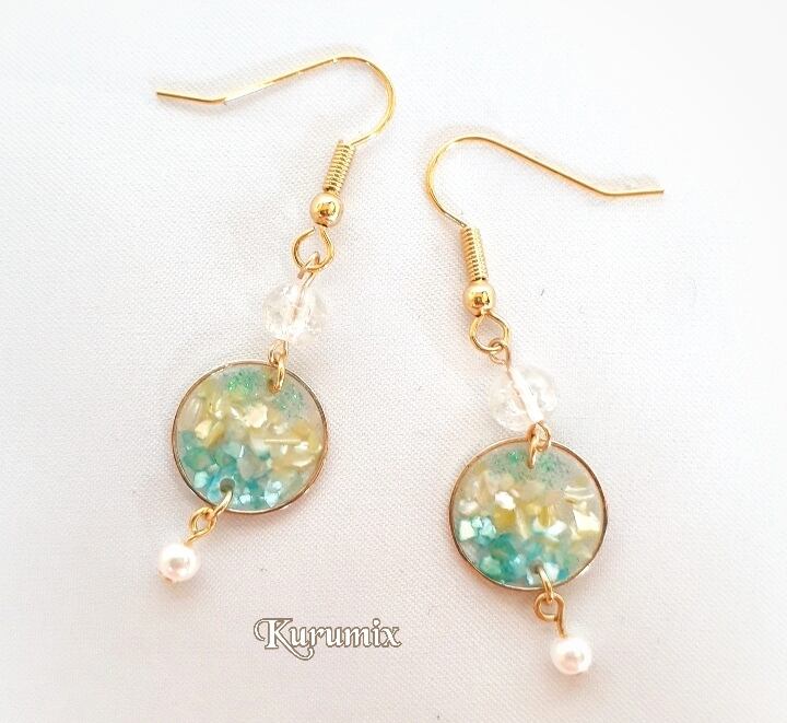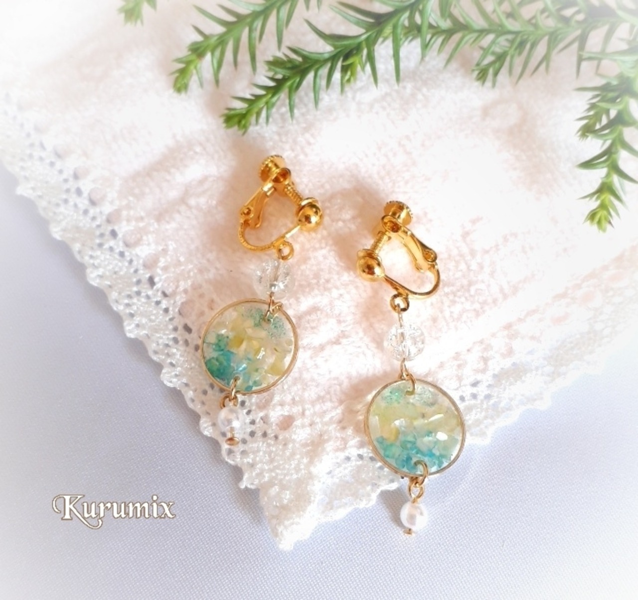 ゴールドの丸枠に エメラルドグリーンとイエローのシェル・ラメで グラデーションに仕上げました。クラッシュボール・小さなパールの3連がゆらゆら揺れて動き出すあるアクセサリーです。光りの当たり方、角度によって色味が変わり楽しめ、明るい色合いが耳元を華やかにします。ショートヘアやアップスタイルにお勧めです。