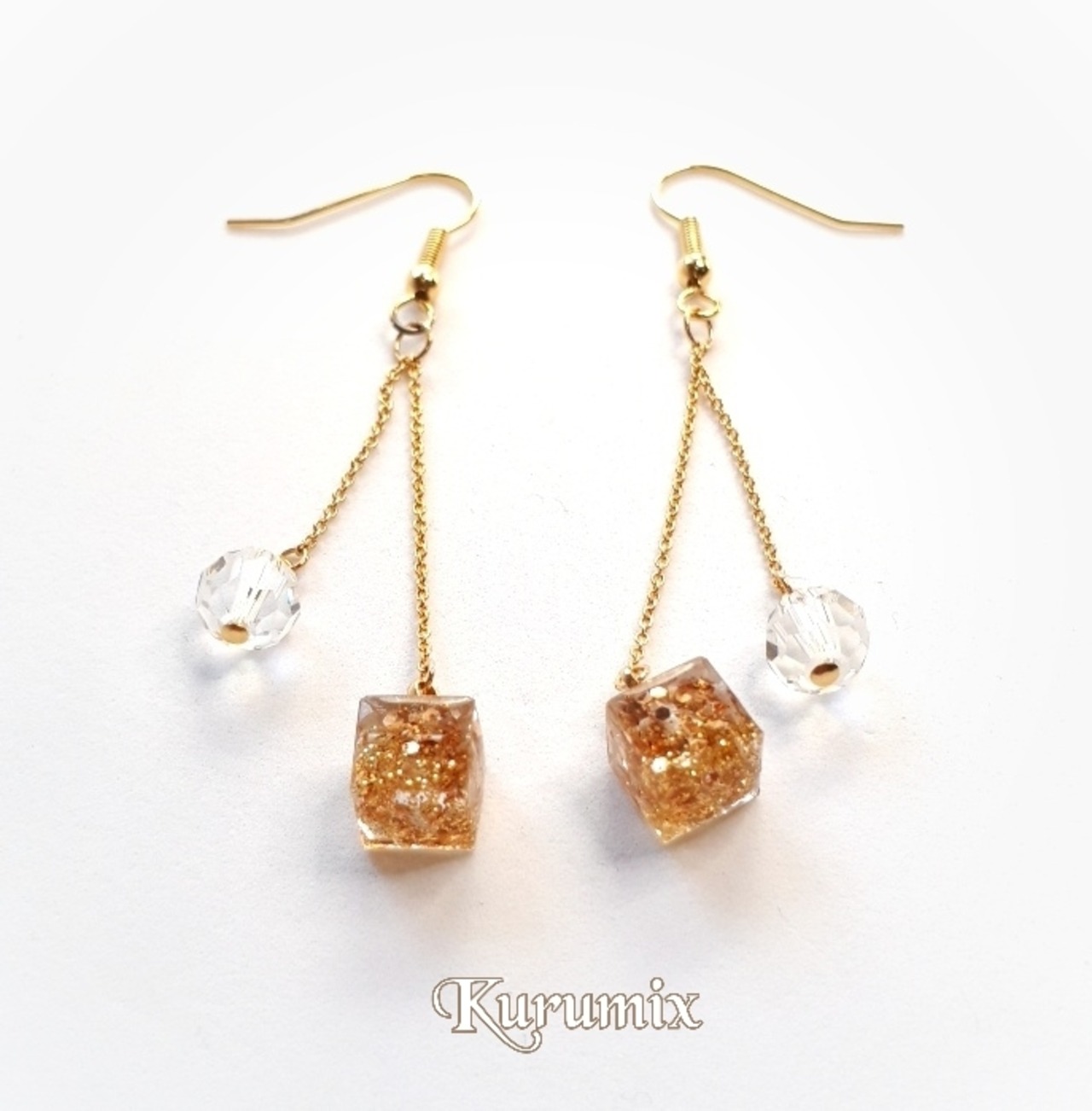 【送料無料】◆◇ピアス・イヤリング選べます◆◇ ゴールドキューブ & ビーズチェーン レジンピアス/イヤリング