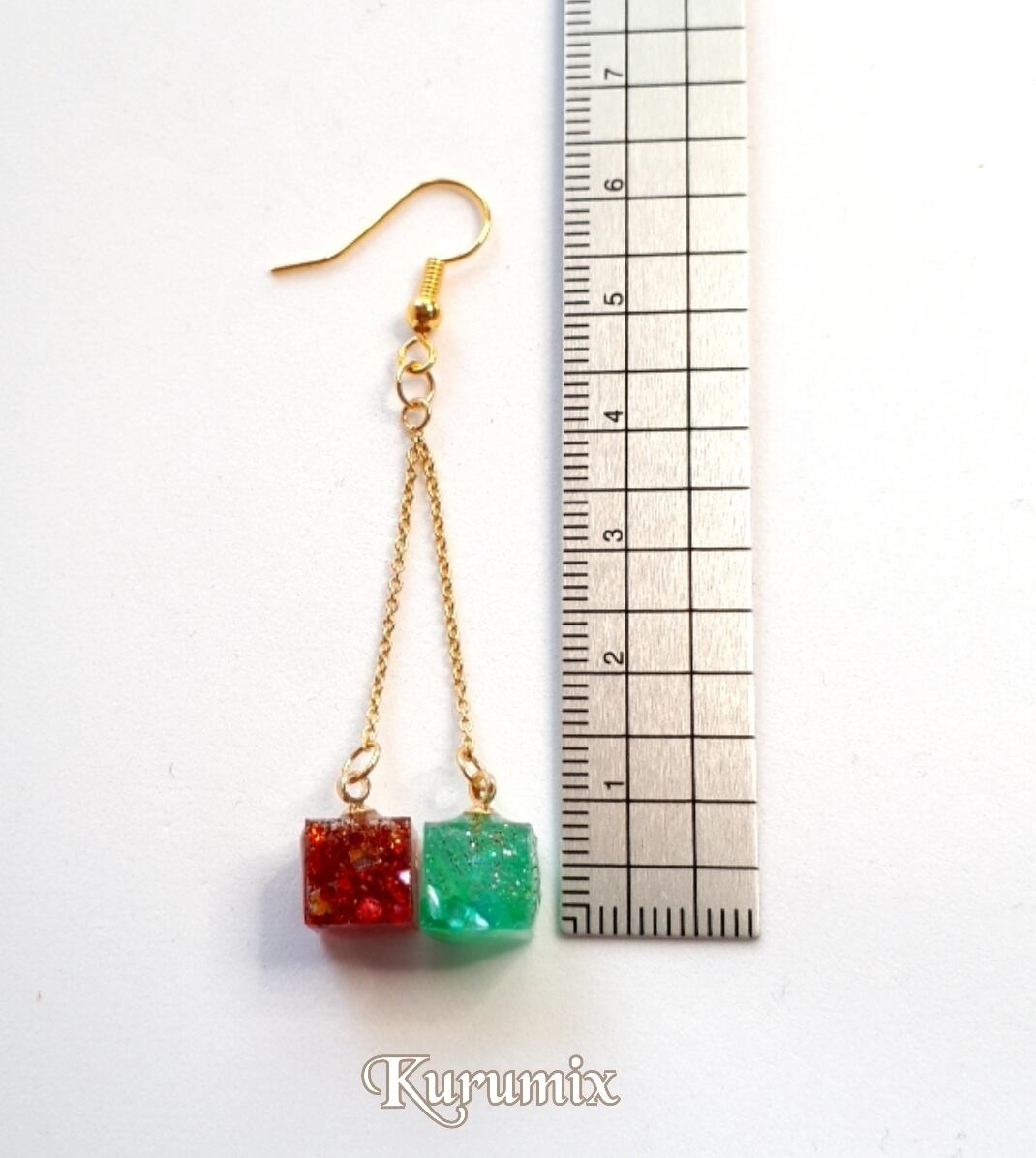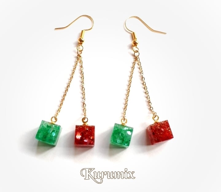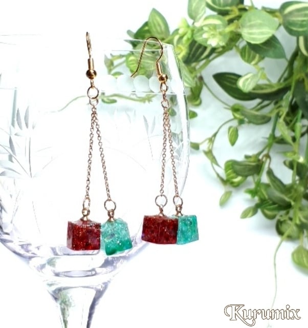 Base【送料無料】◆◇ピアス・イヤリング選べます◆◇ クリスマスカラーキャンディ☆キューブ・ツインチェーン レジンピアス/イヤリング