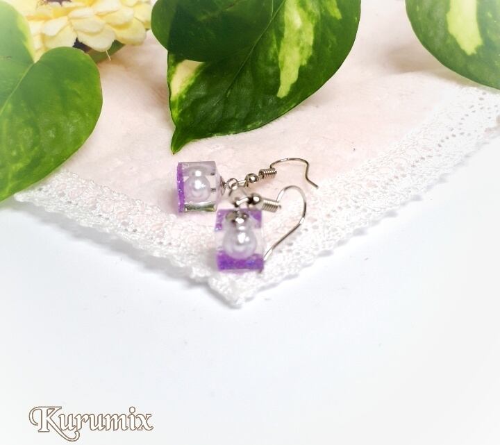 人気のキューブシリーズ。底にパープルラメを沈めて、パールで閉じ込めました。小ぶりながら存在感のある煌めきのあるアクセサリーです。小さいサイズですので、どのシーンでもお気軽にお使い頂けます。