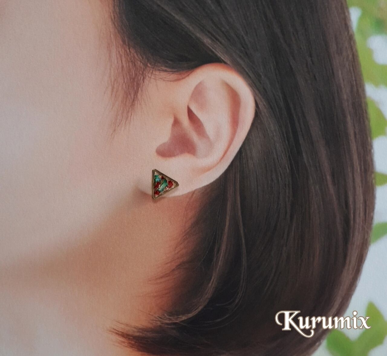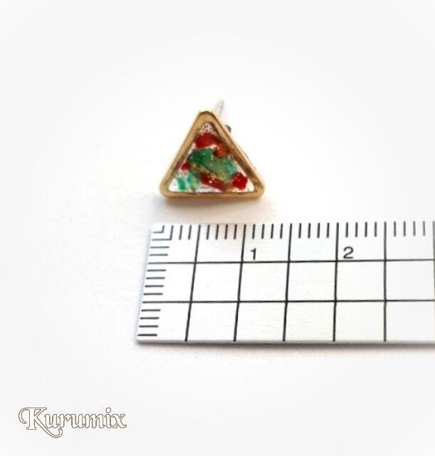 【送料無料】ゴールドと三角枠に、赤・緑のシェルとゴールドラメを散りばめたクリスマスカラーのレジンピアスです。ぷっくりと加工して仕上げました。クリスマス限定期間に、ぜひ女子会やパーティに連れてってください♪