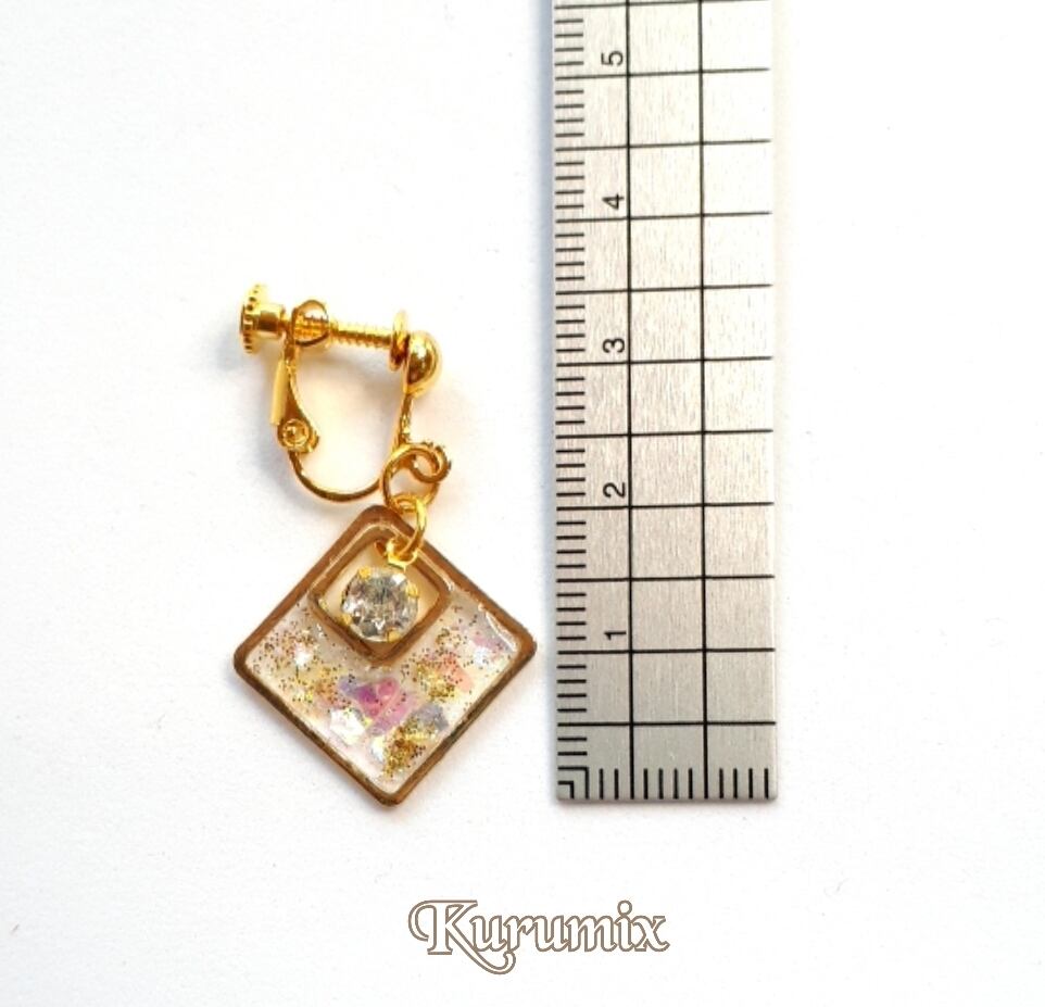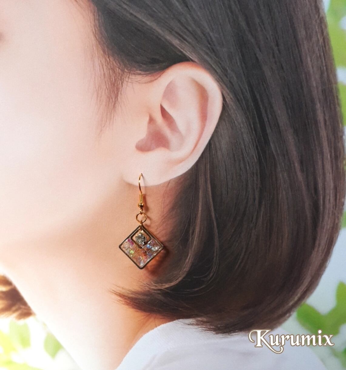 人気のスクエア枠に、オーロラとゴールドラメを配合して散りばめました。ポイントは きらりと輝くラインストーン。オーロラが 太陽光、室内光、角度によって様々な色合いが楽しめます。耳元が華やかになるので、ショートヘアやアップスタイルにもお勧めです。