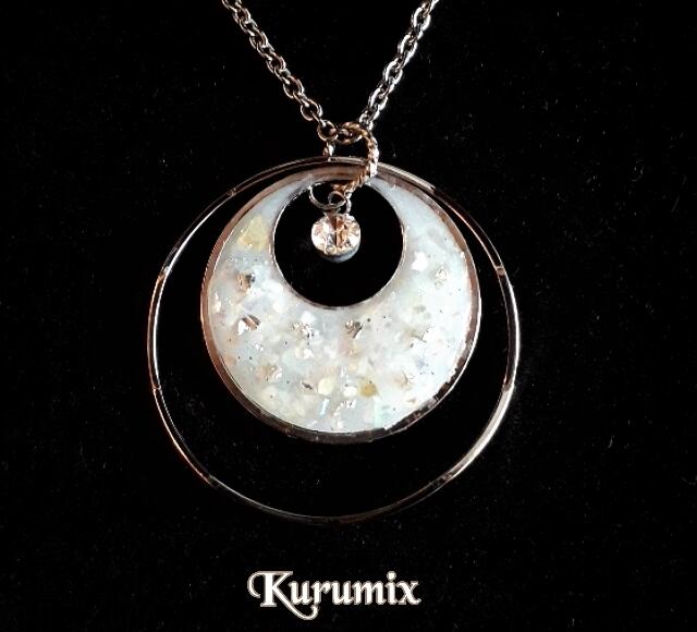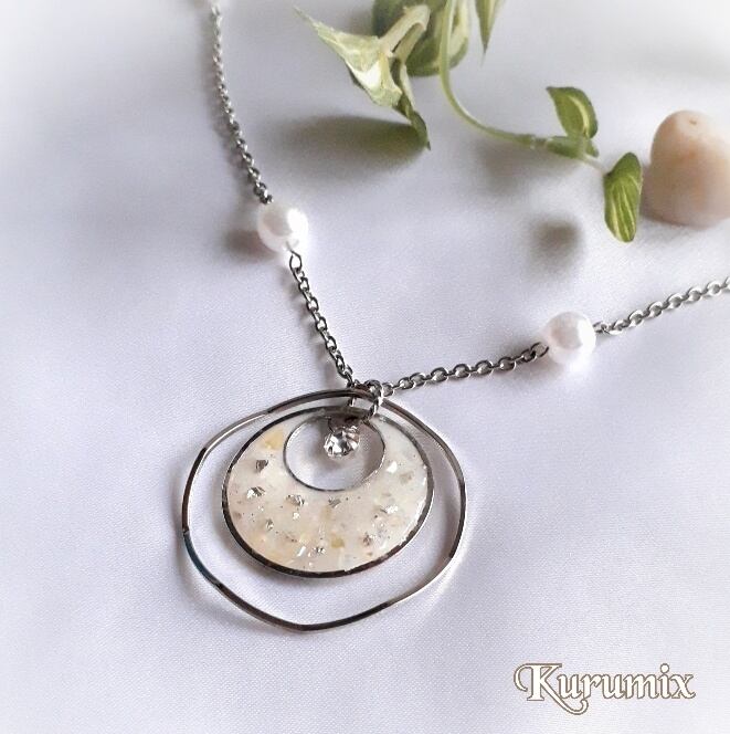 乳白色のレジンをベースに、ホワイトシェル・オーロラ・ゴールドラメを散りばめて、ぷっくりと仕上げました。きらりと輝く ガラスストーンがポイント✧ パール使いのチェーンにもこだわりました。15gの大変 軽い素材なので、1日付けても快適に過ごせます。オールシーズンにお使い頂けるアイテム。