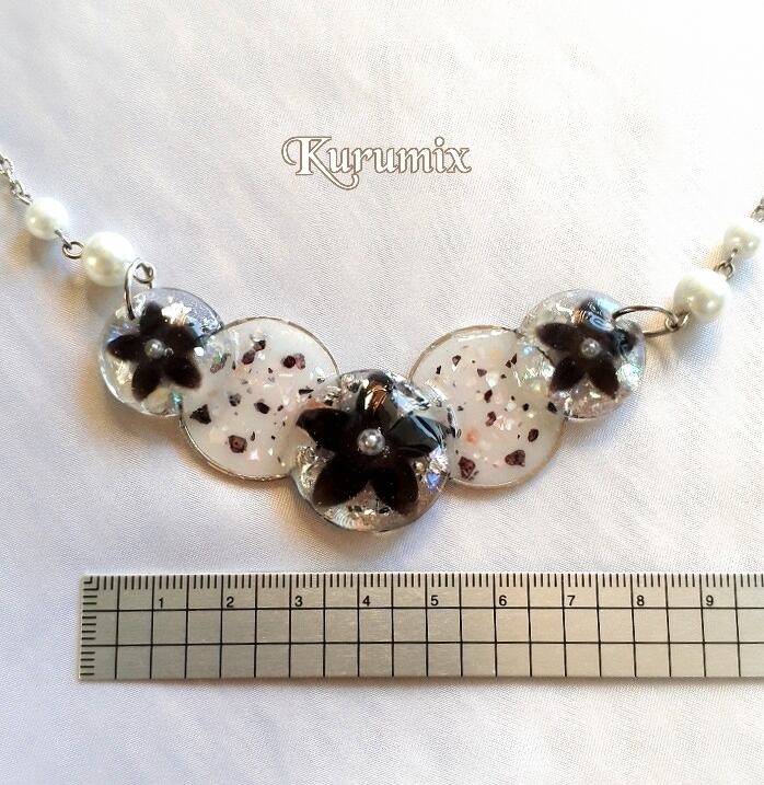 ダークブラウンのお花にシルバーフレークとオーロラを散りばめて ぷっくりと丸い形に仕上げました。中央のサイドのレジンは、ホワイトベースにアメジストカラーと薄いピンクのシェルを配合して重ねたので、しっとりと落ち着いた雰囲気に♡ 僅か25g!の軽さなので、1日付けても快適に過ごせます。チョーカー風に短めに付けても、ハイネックに合わせても、合わせてやすいアイテムです。