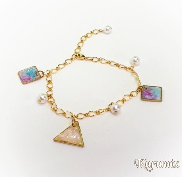 四角枠のホワイトベースにパープルとエメラルドグリーンのシェルと、三角枠にピン系のシェルで透明感を出した、ゴールドブレスレット。光りの当たり方、角度によって色味が変わり楽しめます。着け心地は軽く快適です。