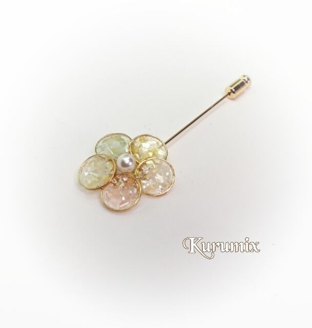 丸枠に、薄いピンク・イエロー・グリーン系のシェルを閉じ込めました。真ん中のパールがポイント。光りの当たり方、角度によって濃く見えたり淡く見えたりと色味が変わり楽しめます。お帽子だけではなく、襟元に付けて お洒落のアクセントに♪