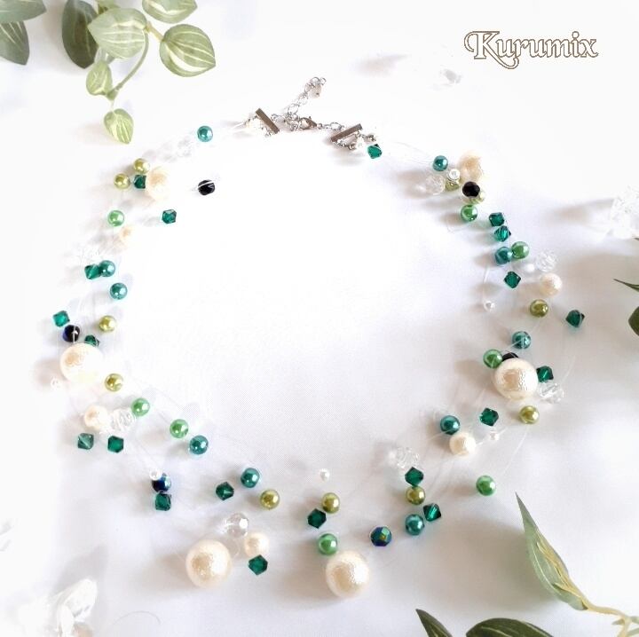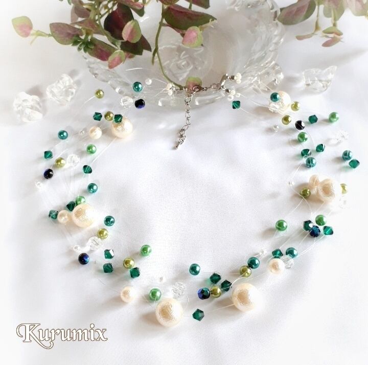 ✧透明なテグスを使用しているので、遠目から見ると、パールやビーズが 首元を散りばめられているような 華やかな演出をします。