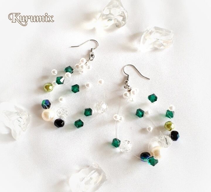 ✧グリーンのスワロスキーを中心に、コットンパールや チェコビーズなど 耳元から降り注いでいるように 華やかに演出します✨