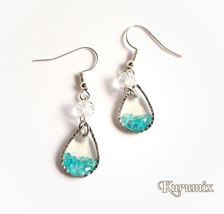 ✧ 人気のしずく型に、涼しげなエメラルドブルーのシェルとブルーオーロラ配合し、水の底に沈めたイメージで仕上げました。