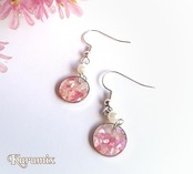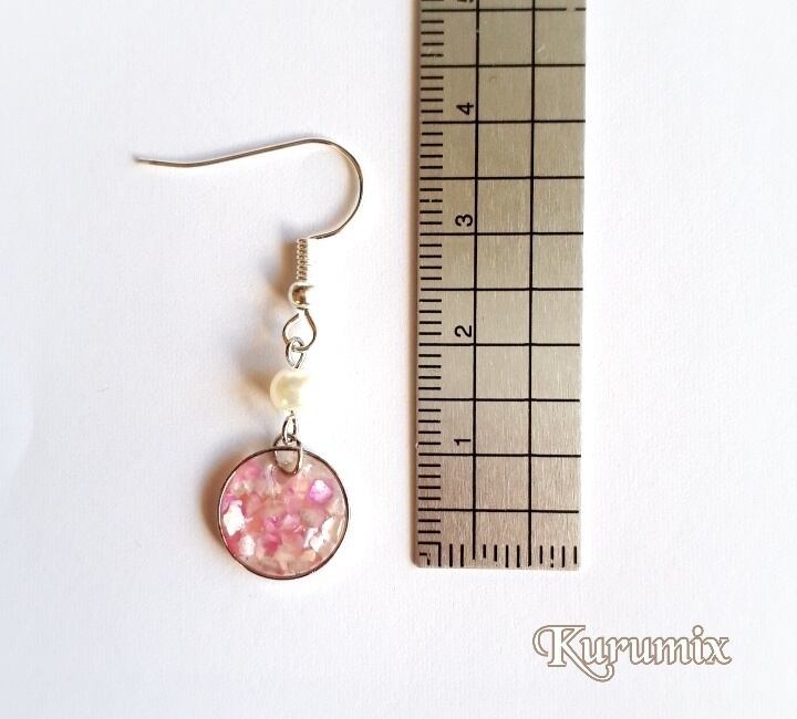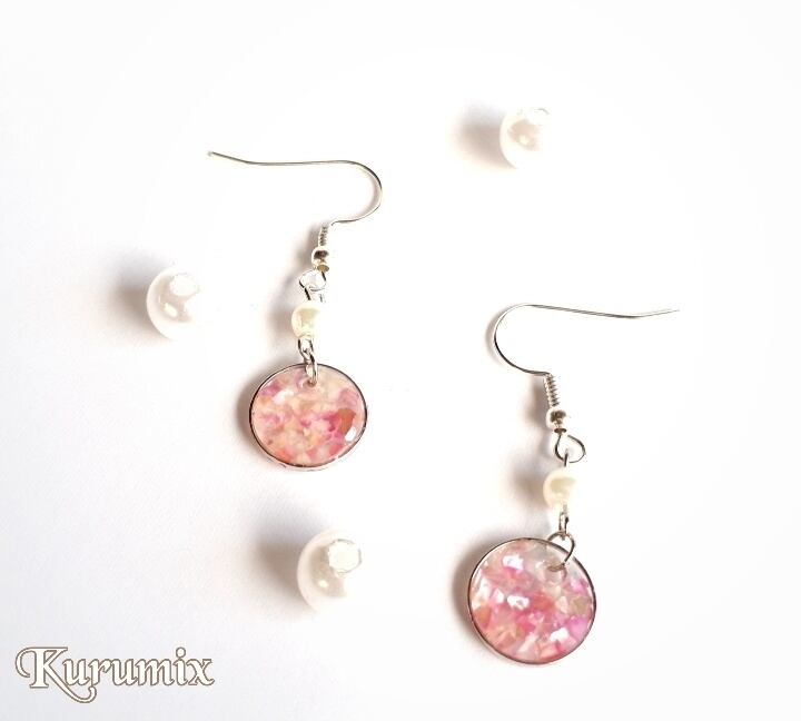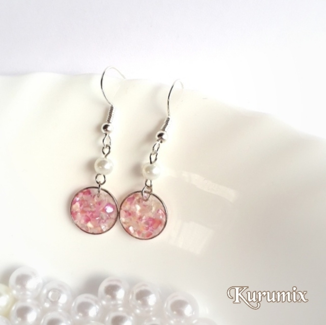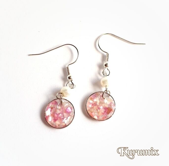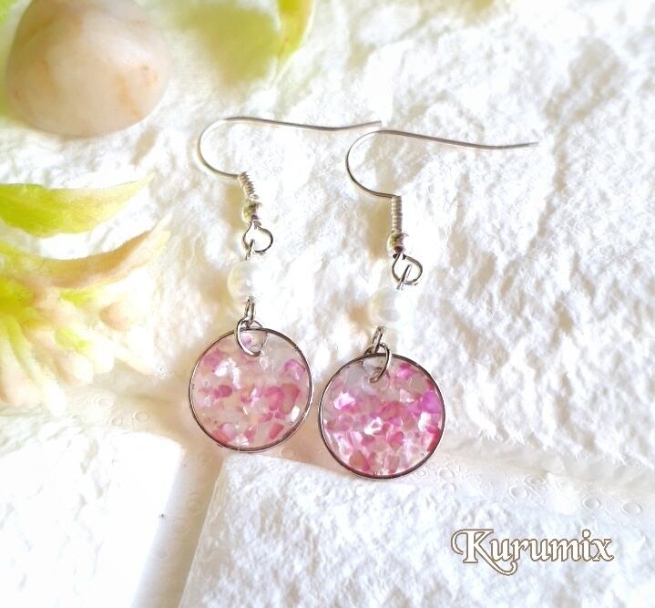 シルバー小さい丸枠に ピンクとホワイトのシェルを散りばめました。小さなパールと揺れて動きのあるアクセサリーになります。